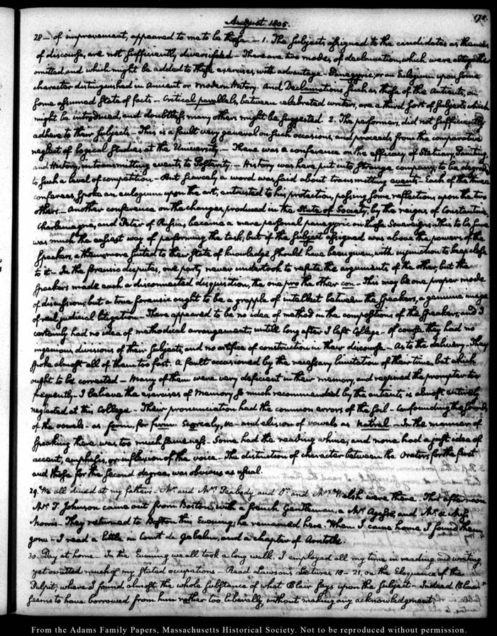 View full, authoritative transcriptions with page images of the diaries at John Quincy Adams Digital Diary part of the Primary Source Cooperative at the MHS.