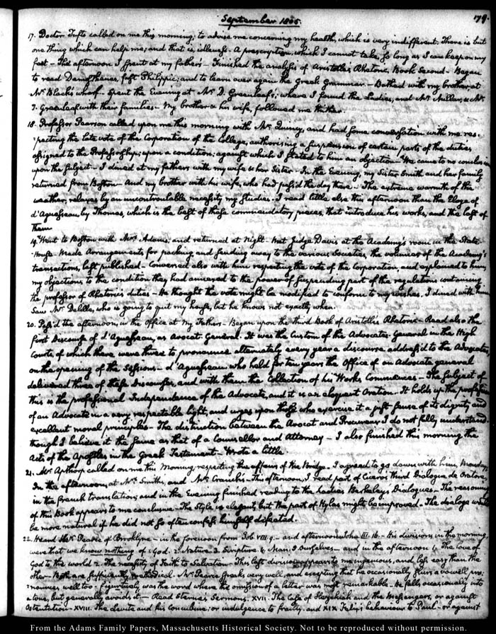 View full, authoritative transcriptions with page images of the diaries at John Quincy Adams Digital Diary part of the Primary Source Cooperative at the MHS.