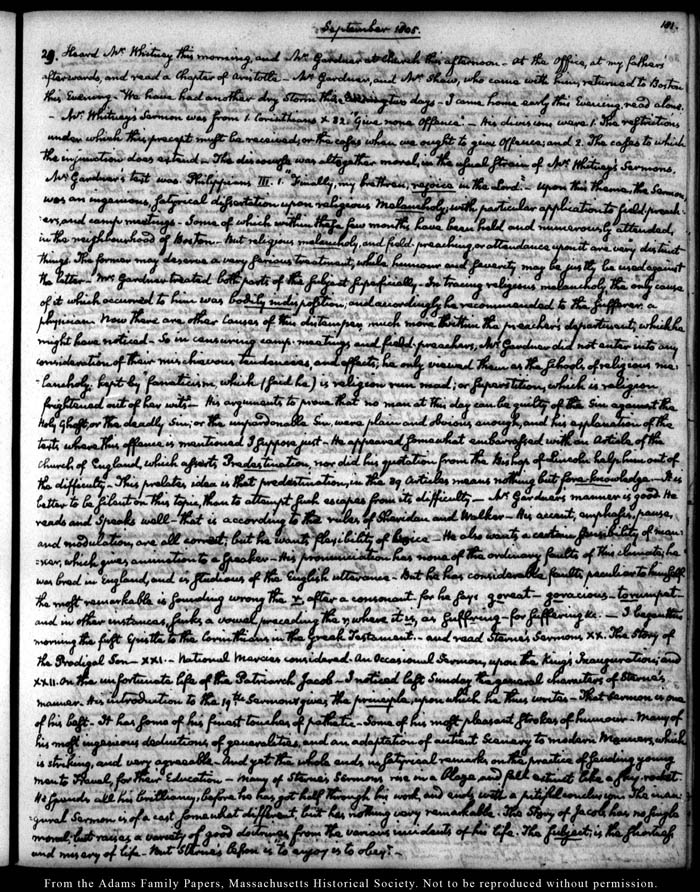 View full, authoritative transcriptions with page images of the diaries at John Quincy Adams Digital Diary part of the Primary Source Cooperative at the MHS.
