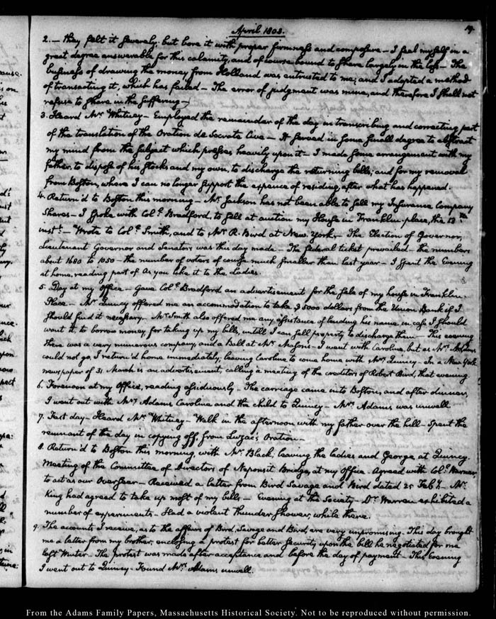 View full, authoritative transcriptions with page images of the diaries at John Quincy Adams Digital Diary part of the Primary Source Cooperative at the MHS.