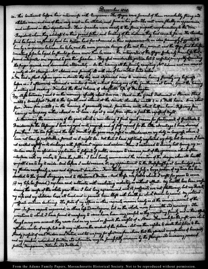 View full, authoritative transcriptions with page images of the diaries at John Quincy Adams Digital Diary part of the Primary Source Cooperative at the MHS.