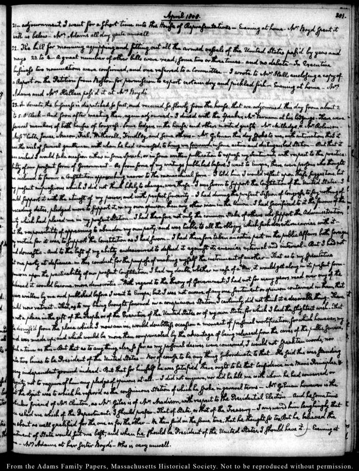 View full, authoritative transcriptions with page images of the diaries at John Quincy Adams Digital Diary part of the Primary Source Cooperative at the MHS.