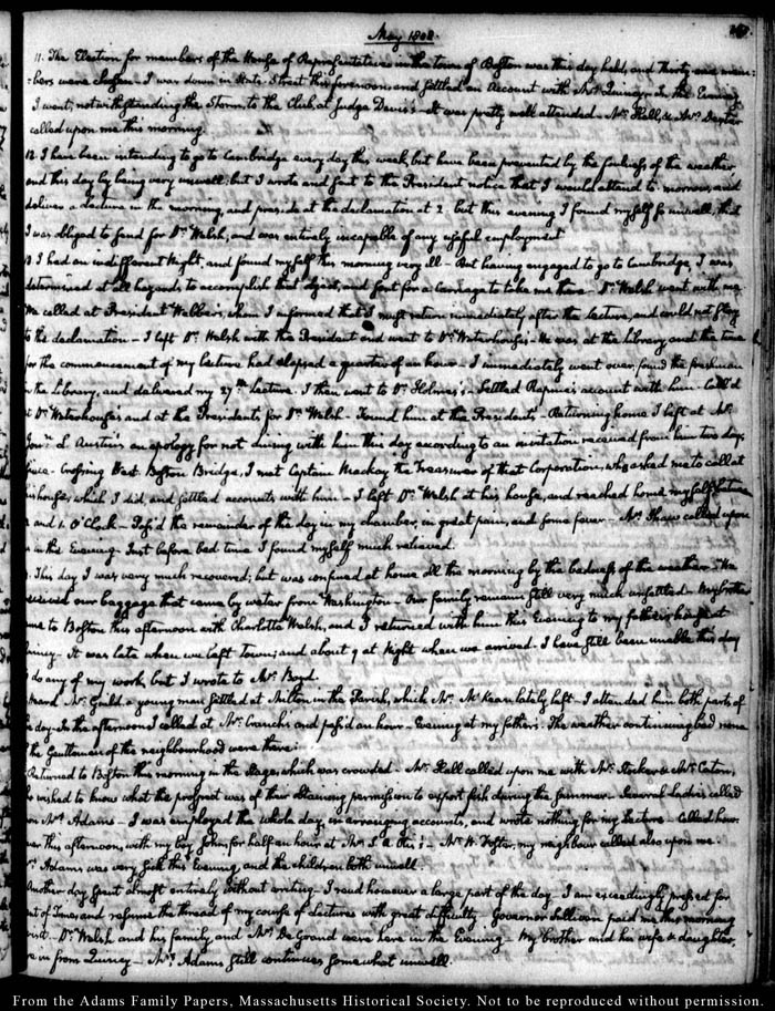 View full, authoritative transcriptions with page images of the diaries at John Quincy Adams Digital Diary part of the Primary Source Cooperative at the MHS.