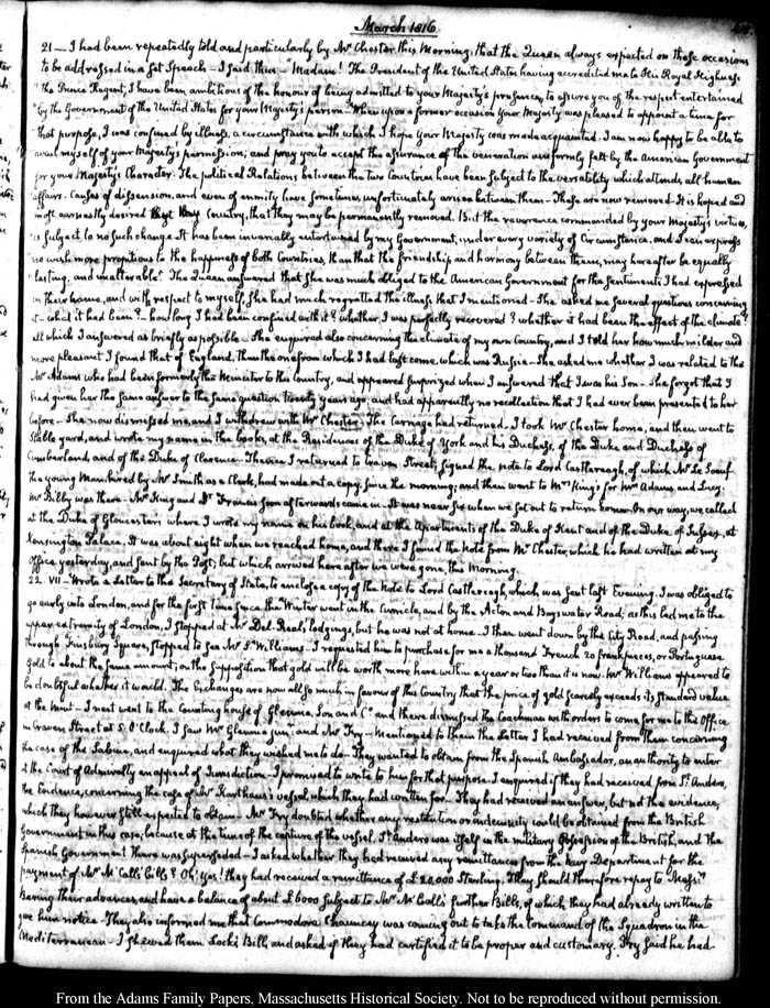 View full, authoritative transcriptions with page images of the diaries at John Quincy Adams Digital Diary part of the Primary Source Cooperative at the MHS.