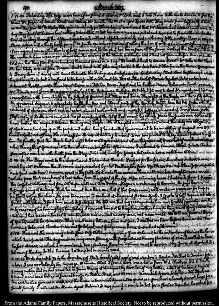 View full, authoritative transcriptions with page images of the diaries at John Quincy Adams Digital Diary part of the Primary Source Cooperative at the MHS.