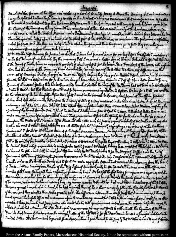 View full, authoritative transcriptions with page images of the diaries at John Quincy Adams Digital Diary part of the Primary Source Cooperative at the MHS.