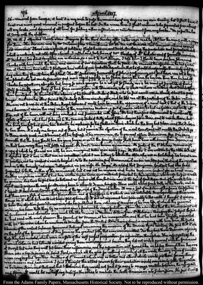 View full, authoritative transcriptions with page images of the diaries at John Quincy Adams Digital Diary part of the Primary Source Cooperative at the MHS.