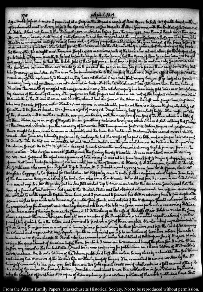 View full, authoritative transcriptions with page images of the diaries at John Quincy Adams Digital Diary part of the Primary Source Cooperative at the MHS.