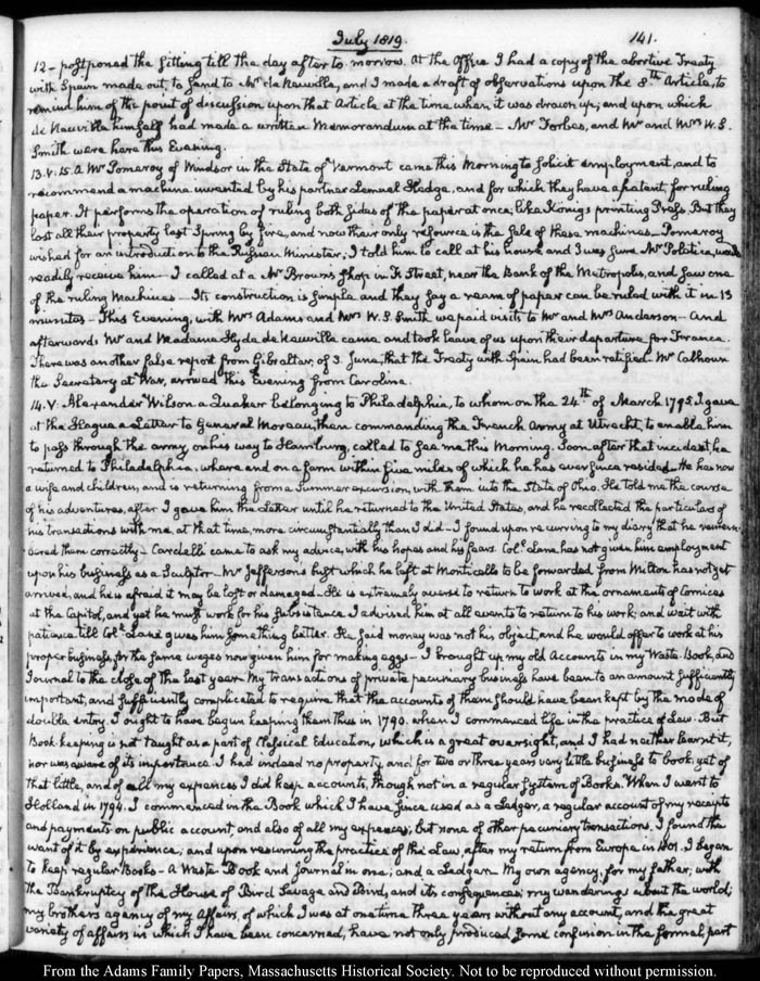View full, authoritative transcriptions with page images of the diaries at John Quincy Adams Digital Diary part of the Primary Source Cooperative at the MHS.
