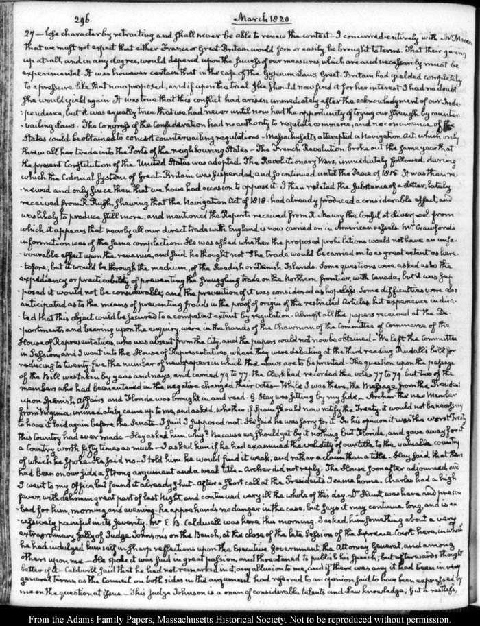 View full, authoritative transcriptions with page images of the diaries at John Quincy Adams Digital Diary part of the Primary Source Cooperative at the MHS.