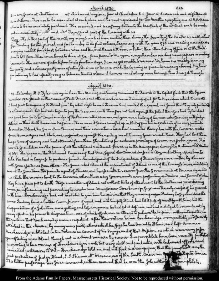 View full, authoritative transcriptions with page images of the diaries at John Quincy Adams Digital Diary part of the Primary Source Cooperative at the MHS.
