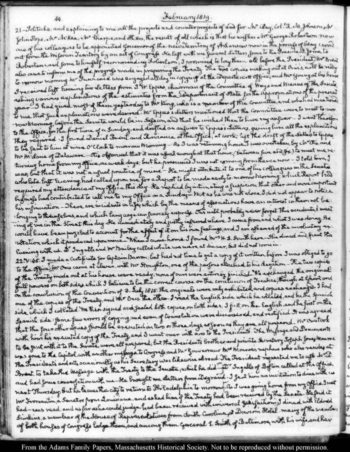 View full, authoritative transcriptions with page images of the diaries at John Quincy Adams Digital Diary part of the Primary Source Cooperative at the MHS.