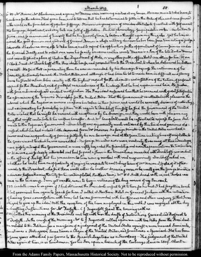 View full, authoritative transcriptions with page images of the diaries at John Quincy Adams Digital Diary part of the Primary Source Cooperative at the MHS.
