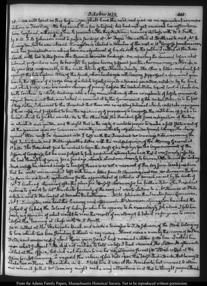View full, authoritative transcriptions with page images of the diaries at John Quincy Adams Digital Diary part of the Primary Source Cooperative at the MHS.