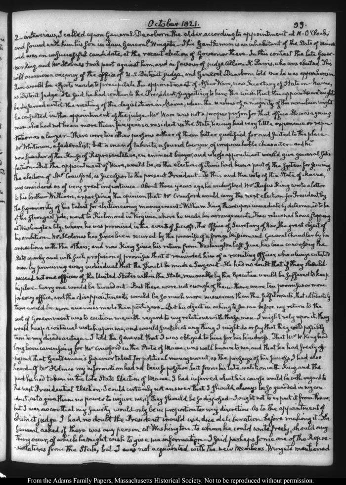 View full, authoritative transcriptions with page images of the diaries at John Quincy Adams Digital Diary part of the Primary Source Cooperative at the MHS.