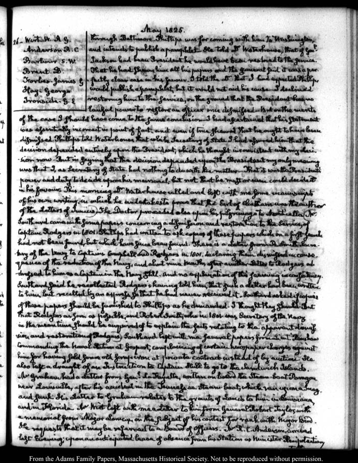 View full, authoritative transcriptions with page images of the diaries at John Quincy Adams Digital Diary part of the Primary Source Cooperative at the MHS.