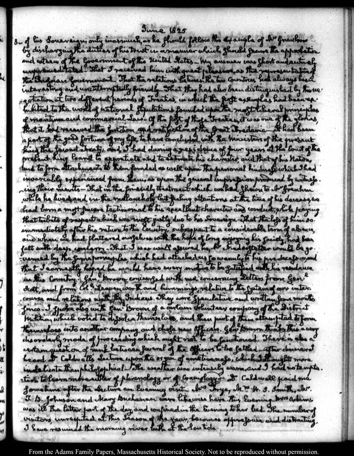 View full, authoritative transcriptions with page images of the diaries at John Quincy Adams Digital Diary part of the Primary Source Cooperative at the MHS.