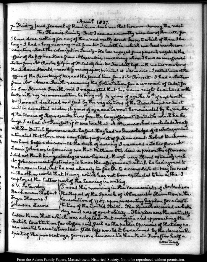 View full, authoritative transcriptions with page images of the diaries at John Quincy Adams Digital Diary part of the Primary Source Cooperative at the MHS.