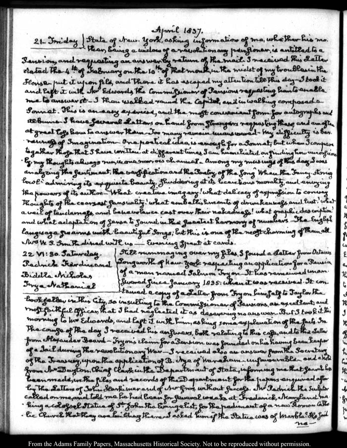 View full, authoritative transcriptions with page images of the diaries at John Quincy Adams Digital Diary part of the Primary Source Cooperative at the MHS.