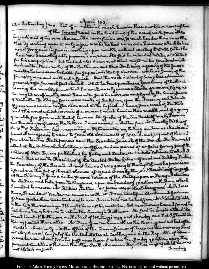 View full, authoritative transcriptions with page images of the diaries at John Quincy Adams Digital Diary part of the Primary Source Cooperative at the MHS.