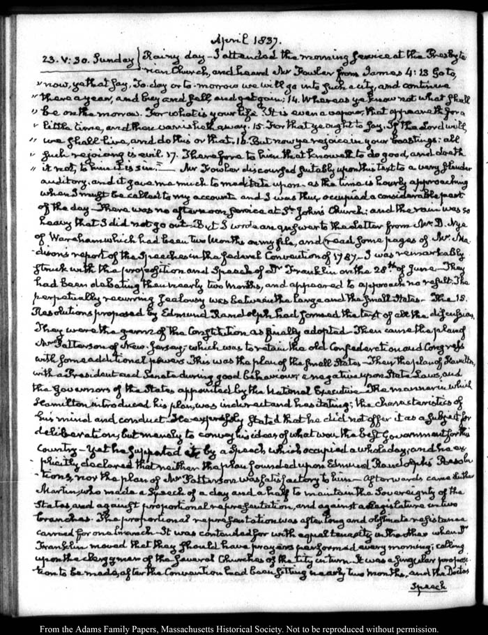 View full, authoritative transcriptions with page images of the diaries at John Quincy Adams Digital Diary part of the Primary Source Cooperative at the MHS.