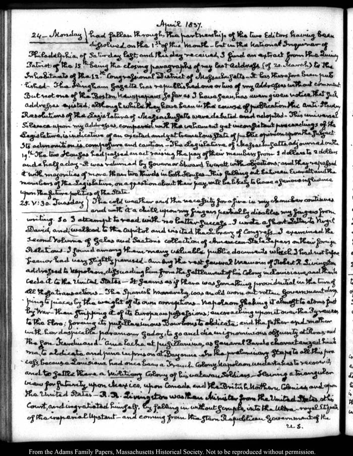 View full, authoritative transcriptions with page images of the diaries at John Quincy Adams Digital Diary part of the Primary Source Cooperative at the MHS.
