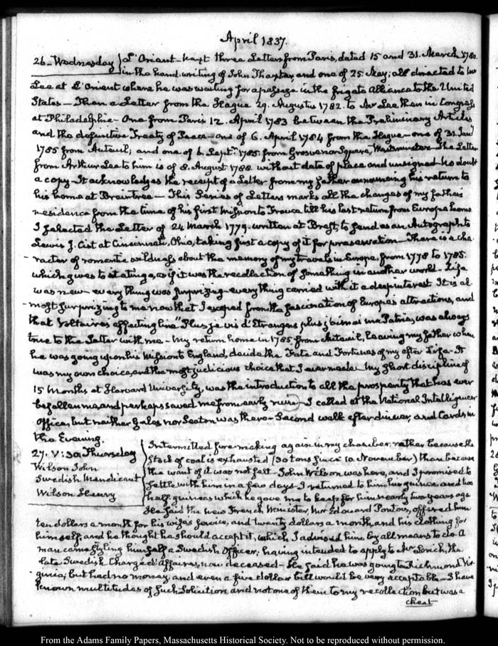 View full, authoritative transcriptions with page images of the diaries at John Quincy Adams Digital Diary part of the Primary Source Cooperative at the MHS.