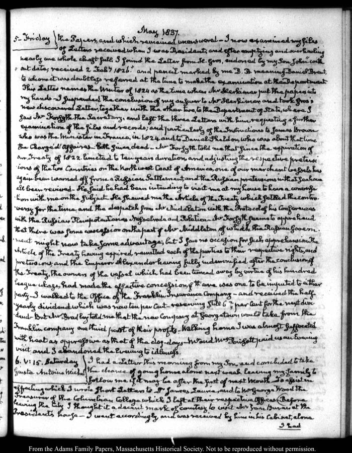 View full, authoritative transcriptions with page images of the diaries at John Quincy Adams Digital Diary part of the Primary Source Cooperative at the MHS.