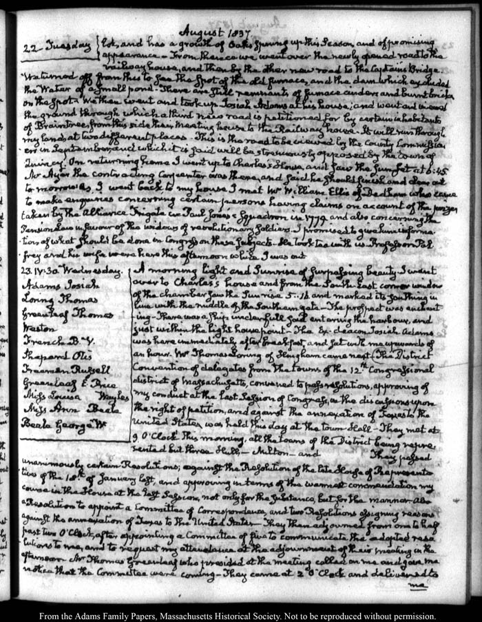 View full, authoritative transcriptions with page images of the diaries at John Quincy Adams Digital Diary part of the Primary Source Cooperative at the MHS.