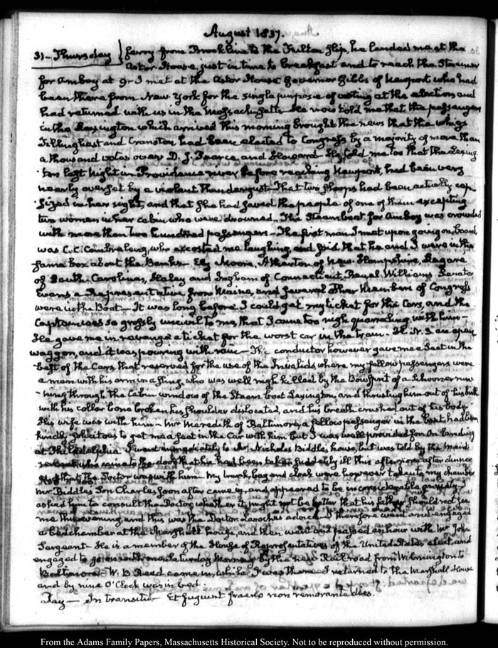 View full, authoritative transcriptions with page images of the diaries at John Quincy Adams Digital Diary part of the Primary Source Cooperative at the MHS.
