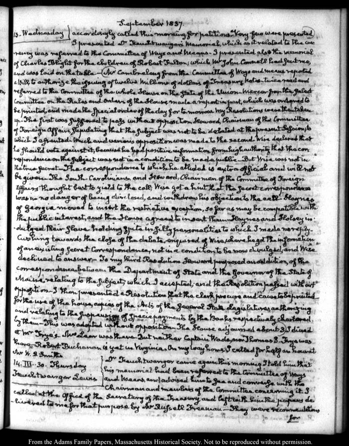 View full, authoritative transcriptions with page images of the diaries at John Quincy Adams Digital Diary part of the Primary Source Cooperative at the MHS.