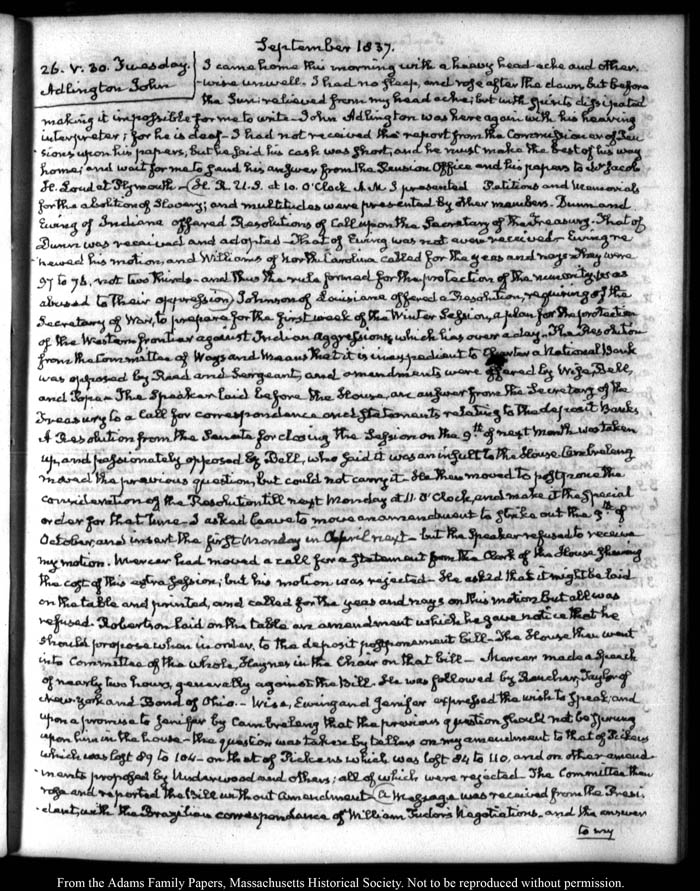 View full, authoritative transcriptions with page images of the diaries at John Quincy Adams Digital Diary part of the Primary Source Cooperative at the MHS.