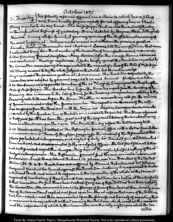 View full, authoritative transcriptions with page images of the diaries at John Quincy Adams Digital Diary part of the Primary Source Cooperative at the MHS.