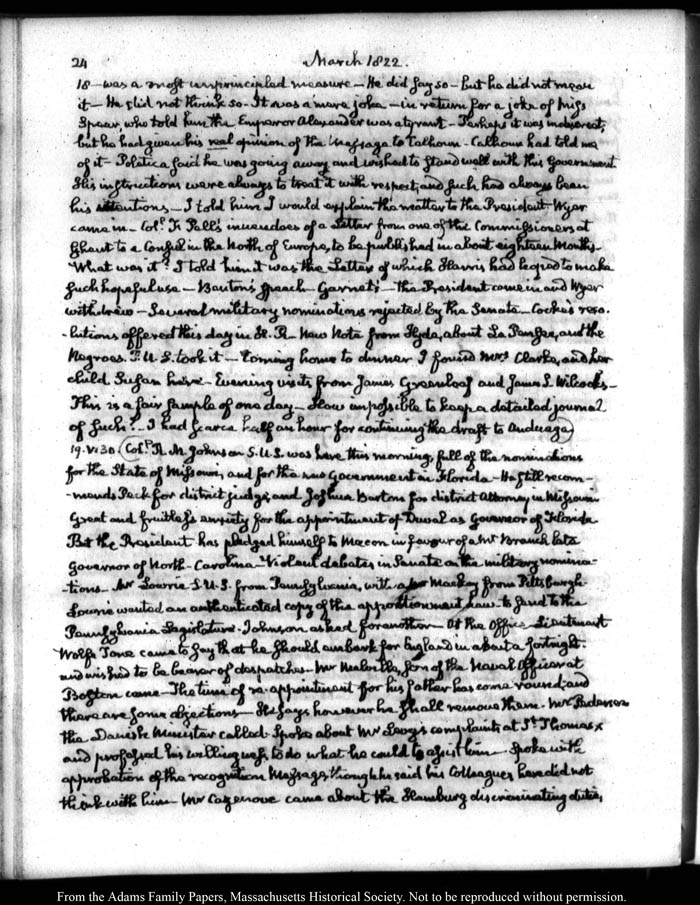 View full, authoritative transcriptions with page images of the diaries at John Quincy Adams Digital Diary part of the Primary Source Cooperative at the MHS.