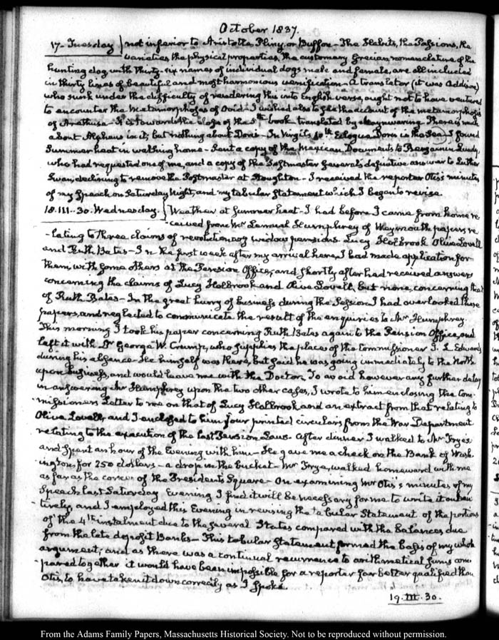View full, authoritative transcriptions with page images of the diaries at John Quincy Adams Digital Diary part of the Primary Source Cooperative at the MHS.