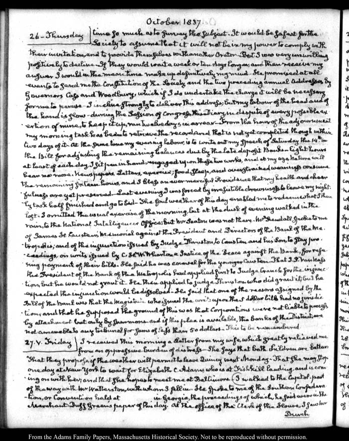 View full, authoritative transcriptions with page images of the diaries at John Quincy Adams Digital Diary part of the Primary Source Cooperative at the MHS.