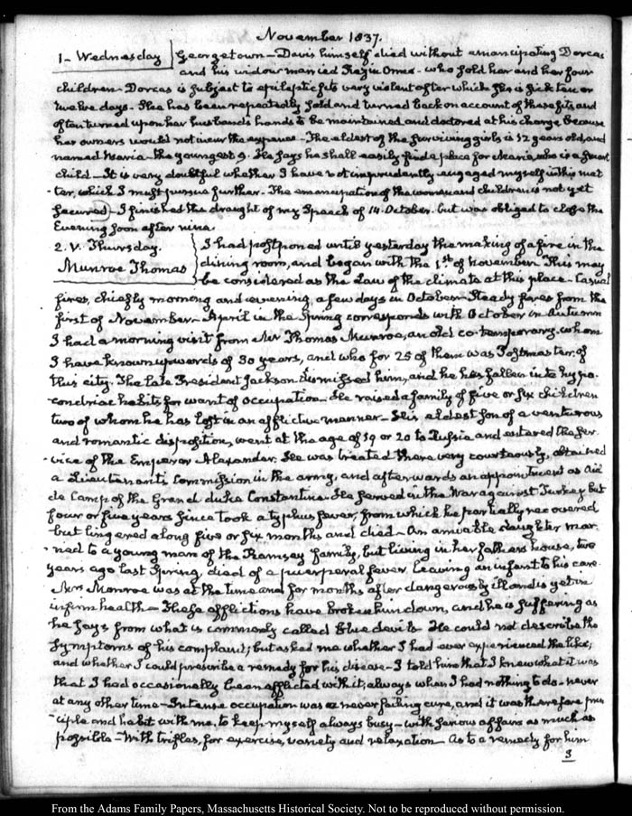 View full, authoritative transcriptions with page images of the diaries at John Quincy Adams Digital Diary part of the Primary Source Cooperative at the MHS.