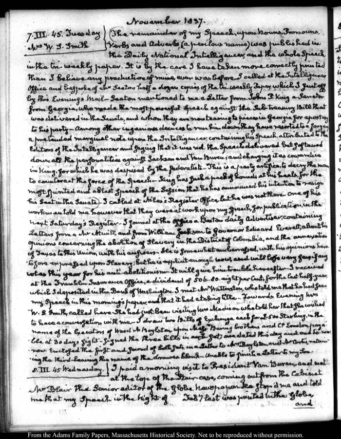 View full, authoritative transcriptions with page images of the diaries at John Quincy Adams Digital Diary part of the Primary Source Cooperative at the MHS.