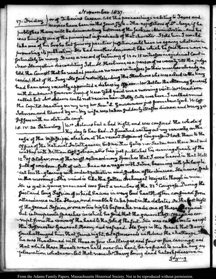 View full, authoritative transcriptions with page images of the diaries at John Quincy Adams Digital Diary part of the Primary Source Cooperative at the MHS.