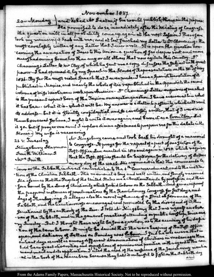 View full, authoritative transcriptions with page images of the diaries at John Quincy Adams Digital Diary part of the Primary Source Cooperative at the MHS.