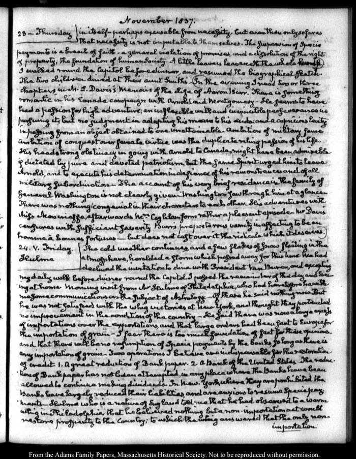 View full, authoritative transcriptions with page images of the diaries at John Quincy Adams Digital Diary part of the Primary Source Cooperative at the MHS.