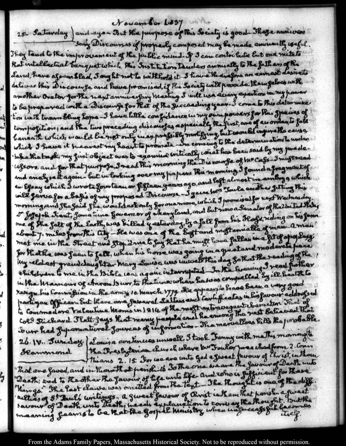 View full, authoritative transcriptions with page images of the diaries at John Quincy Adams Digital Diary part of the Primary Source Cooperative at the MHS.