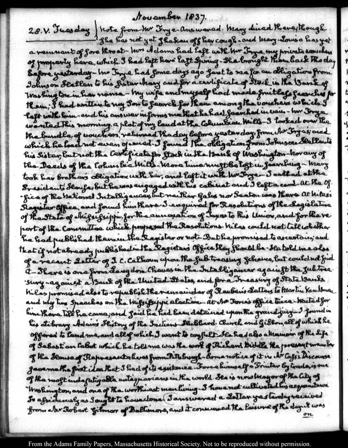 View full, authoritative transcriptions with page images of the diaries at John Quincy Adams Digital Diary part of the Primary Source Cooperative at the MHS.