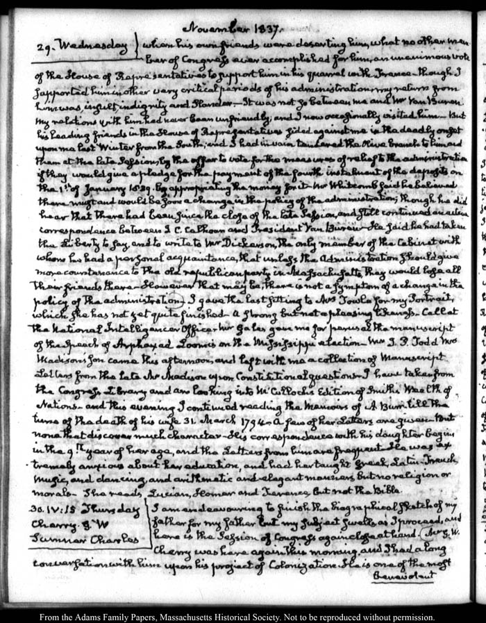 View full, authoritative transcriptions with page images of the diaries at John Quincy Adams Digital Diary part of the Primary Source Cooperative at the MHS.