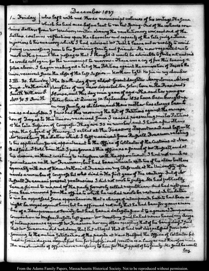 View full, authoritative transcriptions with page images of the diaries at John Quincy Adams Digital Diary part of the Primary Source Cooperative at the MHS.