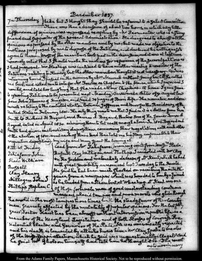 View full, authoritative transcriptions with page images of the diaries at John Quincy Adams Digital Diary part of the Primary Source Cooperative at the MHS.