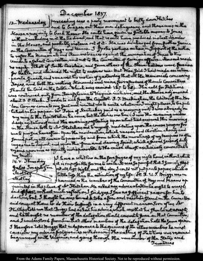 View full, authoritative transcriptions with page images of the diaries at John Quincy Adams Digital Diary part of the Primary Source Cooperative at the MHS.