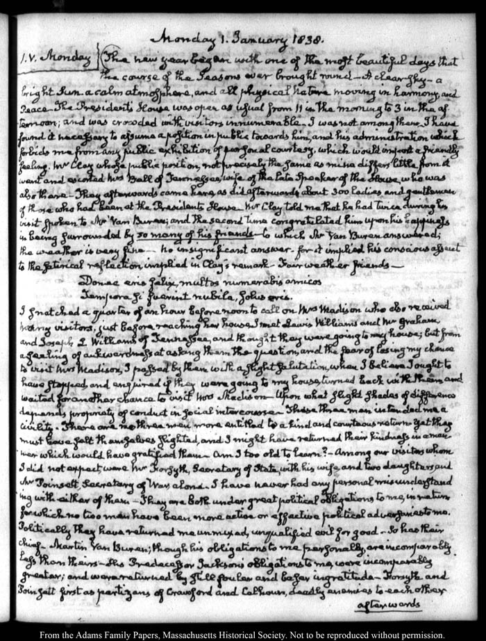 View full, authoritative transcriptions with page images of the diaries at John Quincy Adams Digital Diary part of the Primary Source Cooperative at the MHS.