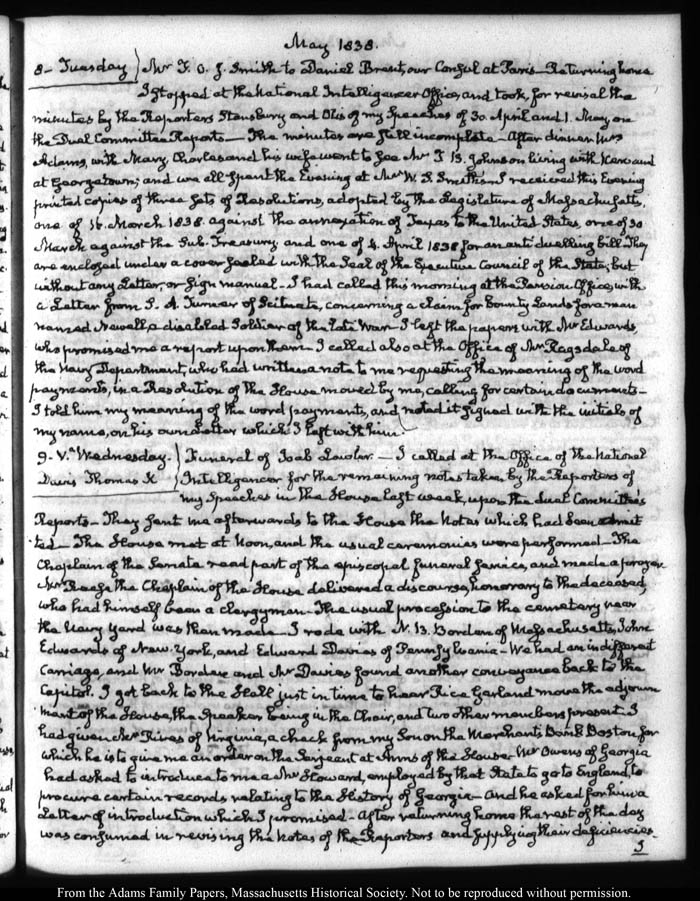 View full, authoritative transcriptions with page images of the diaries at John Quincy Adams Digital Diary part of the Primary Source Cooperative at the MHS.