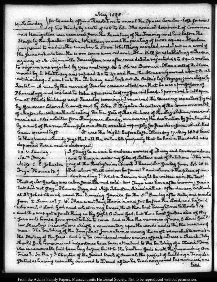 View full, authoritative transcriptions with page images of the diaries at John Quincy Adams Digital Diary part of the Primary Source Cooperative at the MHS.